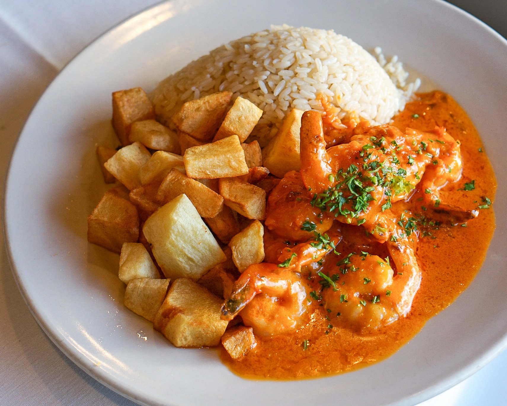 But the sleeper hit here might be the camarão à crème, a delectable dish of shrimp in garlicky cream sauce, served with rice and crispy fried potatoes. It’s rich without being heavy, indulgent without going overboard. The shrimp are plump and perfectly cooked, and the garlic sauce could easily qualify as its own food group.